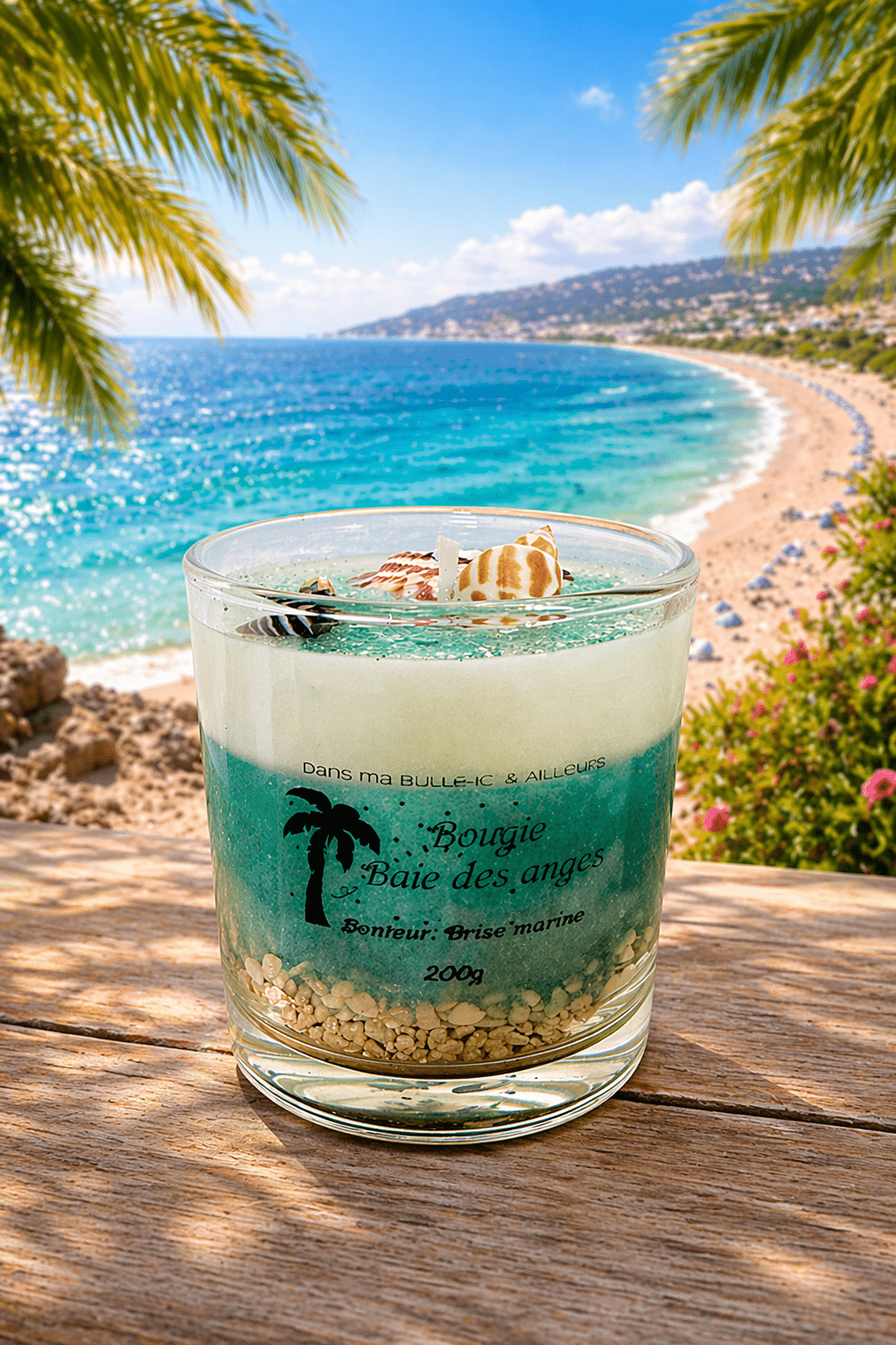 Bougie parfumée artisanale, à base de gel cristal de paraffine haut de gamme, de cire végétale de soja de haute qualité, de colorants en mica pour bougies et de parfum de Grasse (sans CMR, sans phtalate, vegan et sans cruauté animale). Le parfum brise marine vous plonge dans un univers marin rappelant ainsi la fraicheur de l’air marin qui nous caresse toute l’année à Nice! Une dédicace à notre magnifique baie des anges!