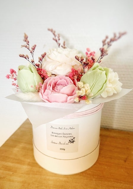 Bougie parfumée artisanale, à base de cire végétale de soja de haute qualité, de colorants en mica ou grains pour bougies et de parfum de Grasse (sans CMR, sans phtalate, vegan et sans cruauté animale). Le parfum bois de rose est un parfum qui incarne l’élégance féminine. Ce bouquet est un bouquet réalisé en fondants de cire. Il a une double utilité; il est à la fois une décoration d’intérieur qui diffuse un parfum léger dans la pièce où il se trouve et chaque fondant peut également être détaché et utilisé avec un brûleur de parfum! C’est la tendance du moment alors n’hésitez plus! Possibilité également de me contacter pour commander un bouquet personnalisé selon vos goûts.