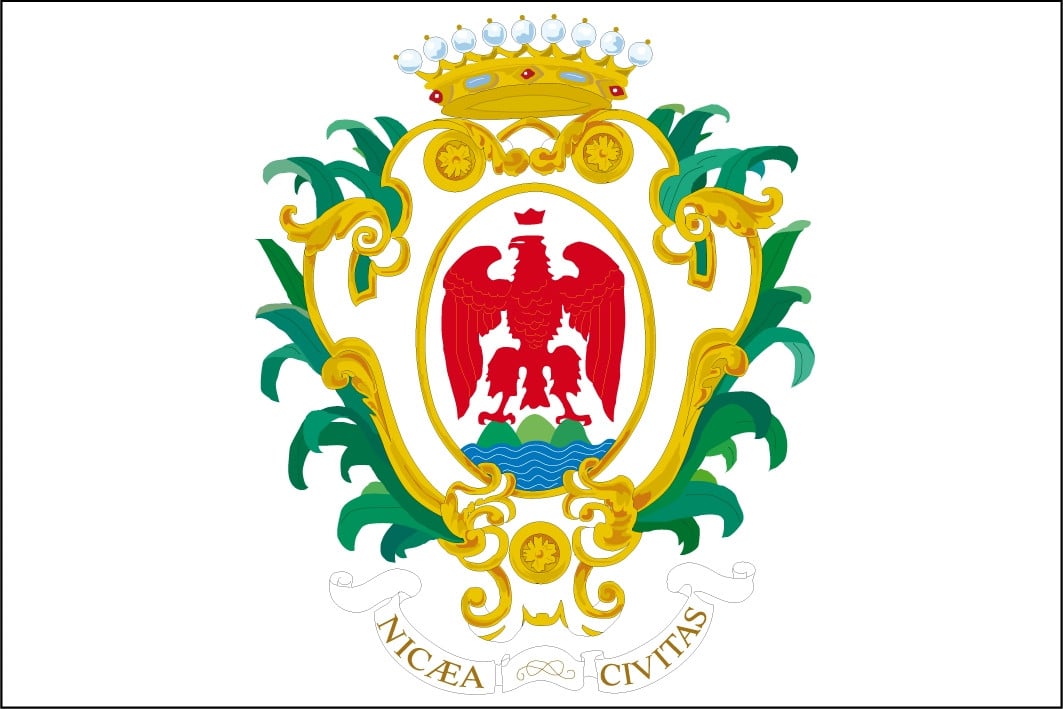 Composé de l’aigle rouge sur les 3 collines, surmonté de la couronne et entouré des palmes vertes sous lesquelles est inscrit sur une bannière, Nicaea Civitas, qui signifie en latin, Ville de Nice.