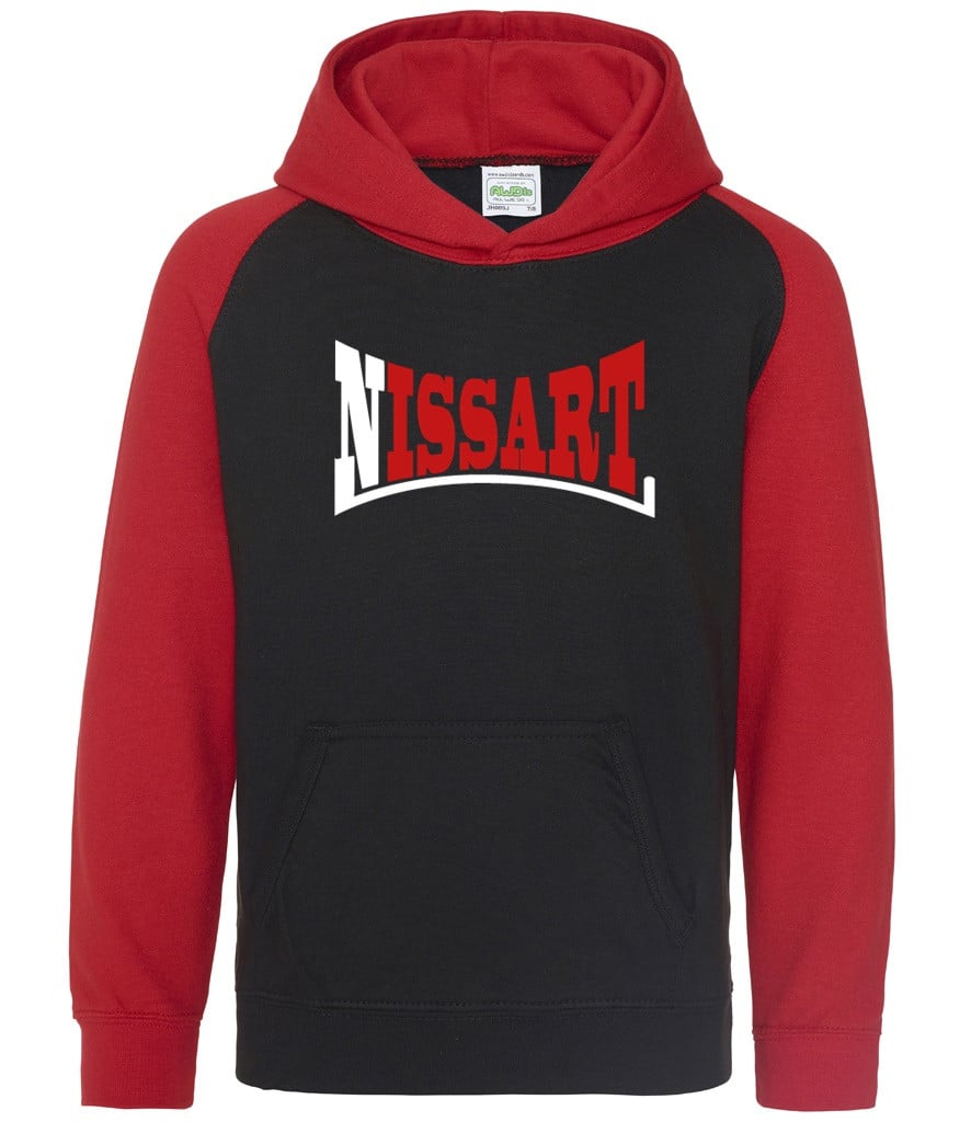 Sweat shirt à capuche bicolore noir et rouge, floqué Nissart en blanc et rouge sur le torse, simple, efficace et fashion !