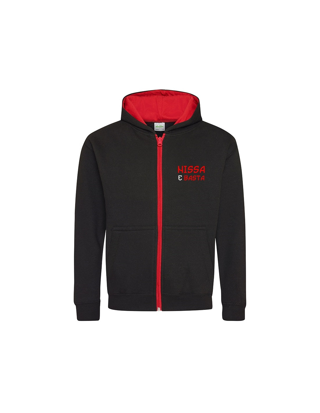 Veste noir, intérieur de la capuche rouge et fermeture rouge